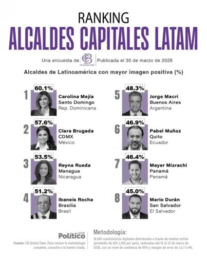 La ejecutiva municipal de la capital dominicana encabezó con la mayor imagen positiva a los alcaldes capitalinos de América Latina, un ranking publicado este 30 de marzo por la firma CB Global Data. Carolina encabeza el ranking con un 60.1 por ciento, superando a Clara Brugada de Ciudad de México (57.6 %), Reyna Rueda de Managua (53.5 %), Ibaneis Roche de Brasilia (51.2 %) y Jorge Macri de Buenos Aires (48.3 %).