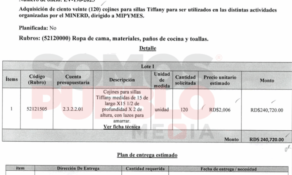 SUR INFORMA RD Santo Domingo.– El Ministerio de Educación (MINERD) se encuentra bajo escrutinio tras licitar un contrato de RD$240,720 para la compra de 120 cojines...