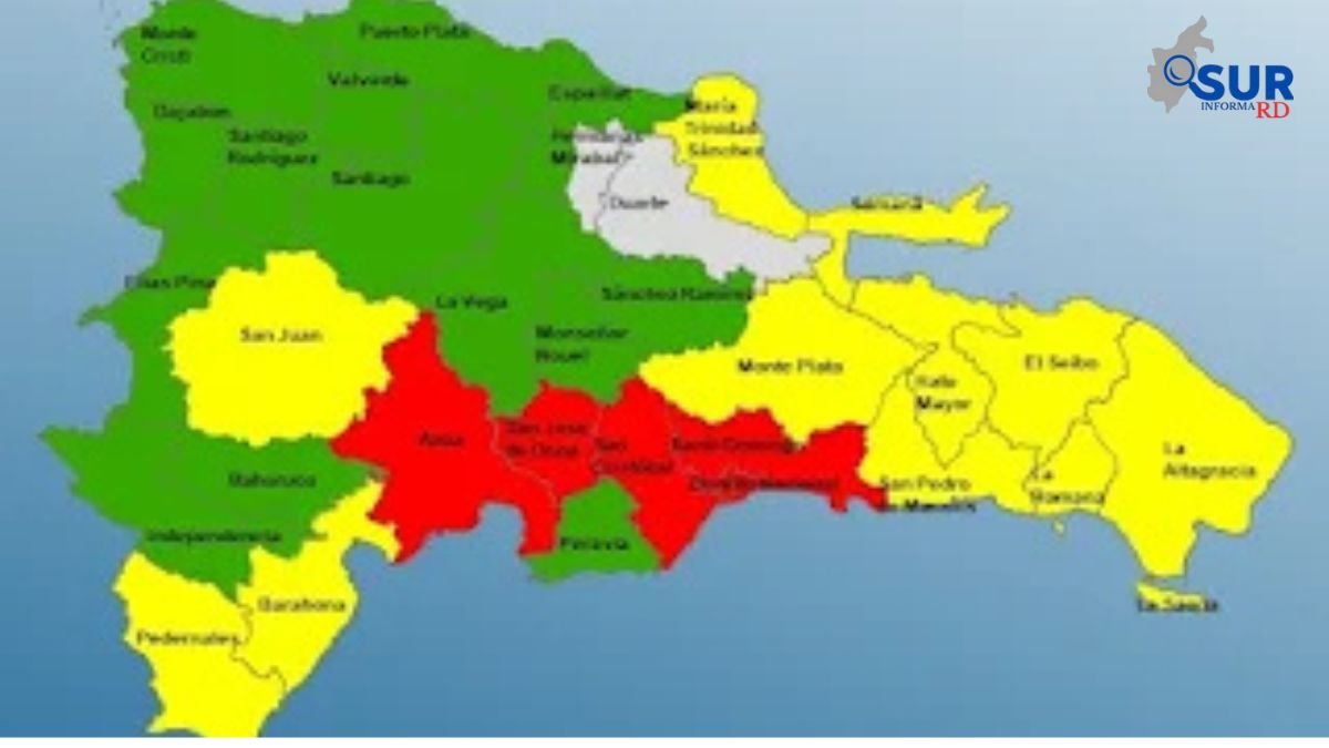 • Alerta verde (14): La Vega, Peravia, Sánchez Ramírez, Montecristi, Dajabón, Bahoruco, Santiago, Santiago Rodríguez, Espaillat, Elías Piña, Valverde, Puerto Plata, Independencia y Monseñor Nouel.