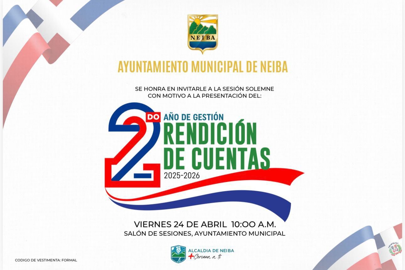 La actividad se llevará a cabo este viernes 24 de abril, a las 10:00 de la mañana, en el Salón de Sesiones del Ayuntamiento Municipal de Neiba, donde se presentarán los principales avances, logros y acciones ejecutadas en beneficio de la comunidad.