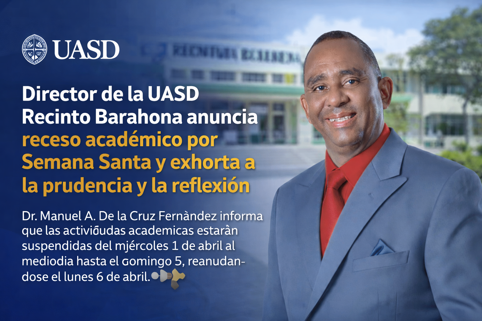 Barahona.– El director general de la Universidad Autónoma de Santo Domingo (UASD), Recinto Barahona, Dr. Manuel A. De la Cruz Fernández, dirigió un mensaje a toda la comunidad universitaria con motivo del inicio del período de receso por la Semana Santa, exhortando a vivir estos días con prudencia, reflexión y en unión familiar.
