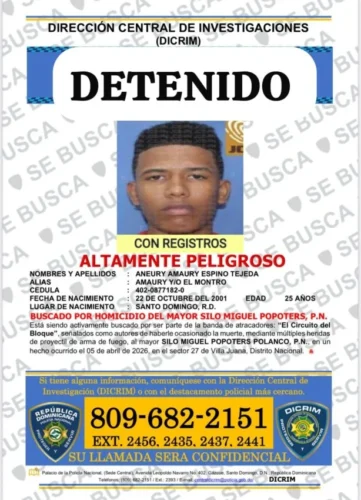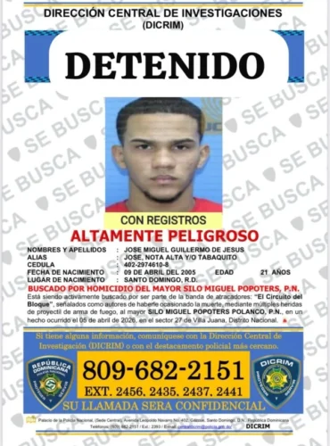 Los detenidos fueron identificados como José Miguel Guillermo de Jesús, conocido como “Nota Alta” y/o “Tabaquito”, y Aneury Amaury Espino Tejeda, alias “El Montro”, quienes son investigados por su presunta relación con el hecho violento ocurrido recientemente en el Distrito Nacional.