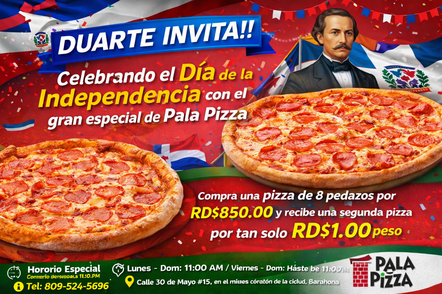 En Barahona, y por ocasión del Día de la Independencia, Pala Pizza trae una oferta que no puedes dejar pasar. Por tiempo limitado, iniciando este lunes 23 y hasta el dia 27, al comprar una pizza de 8 pedazos por RD$850.00 pesos, recibirás una segunda pizza por tan solo RD$1.00 peso.