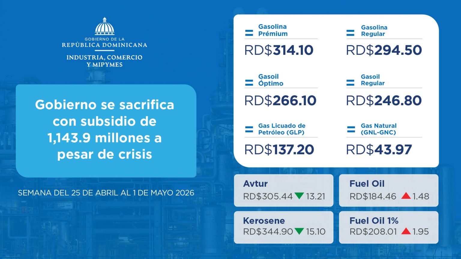 ECONOMICAS.– El Ministerio de Industria, Comercio y MiPymes informó que para la semana comprendida entre el 25 de abril y el 1 de mayo de 2026, los precios de los combustibles esenciales se mantendrán sin variación, mientras que algunos derivados registrarán ligeras bajas y otros incrementos moderados.