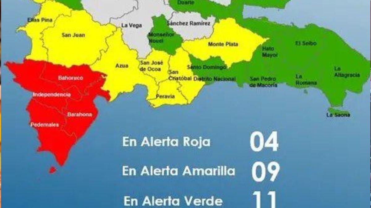 Las provincias en alerta roja son: Barahona, Pedernales, Independencia y Bahoruco. En alerta amarilla se encuentran: San José de Ocoa, Elías Piña, Dajabón, Azúa, San Cristóbal, Peravia, Monte Plata, San Juan y Monte Cristi. Mientras que la alerta verde abarca: Monseñor Nouel, Samaná, San Pedro de Macorís, Santo Domingo, Duarte, La Romana, Hato Mayor, La Altagracia, El Seibo, Santiago Rodríguez y el Distrito Nacional.