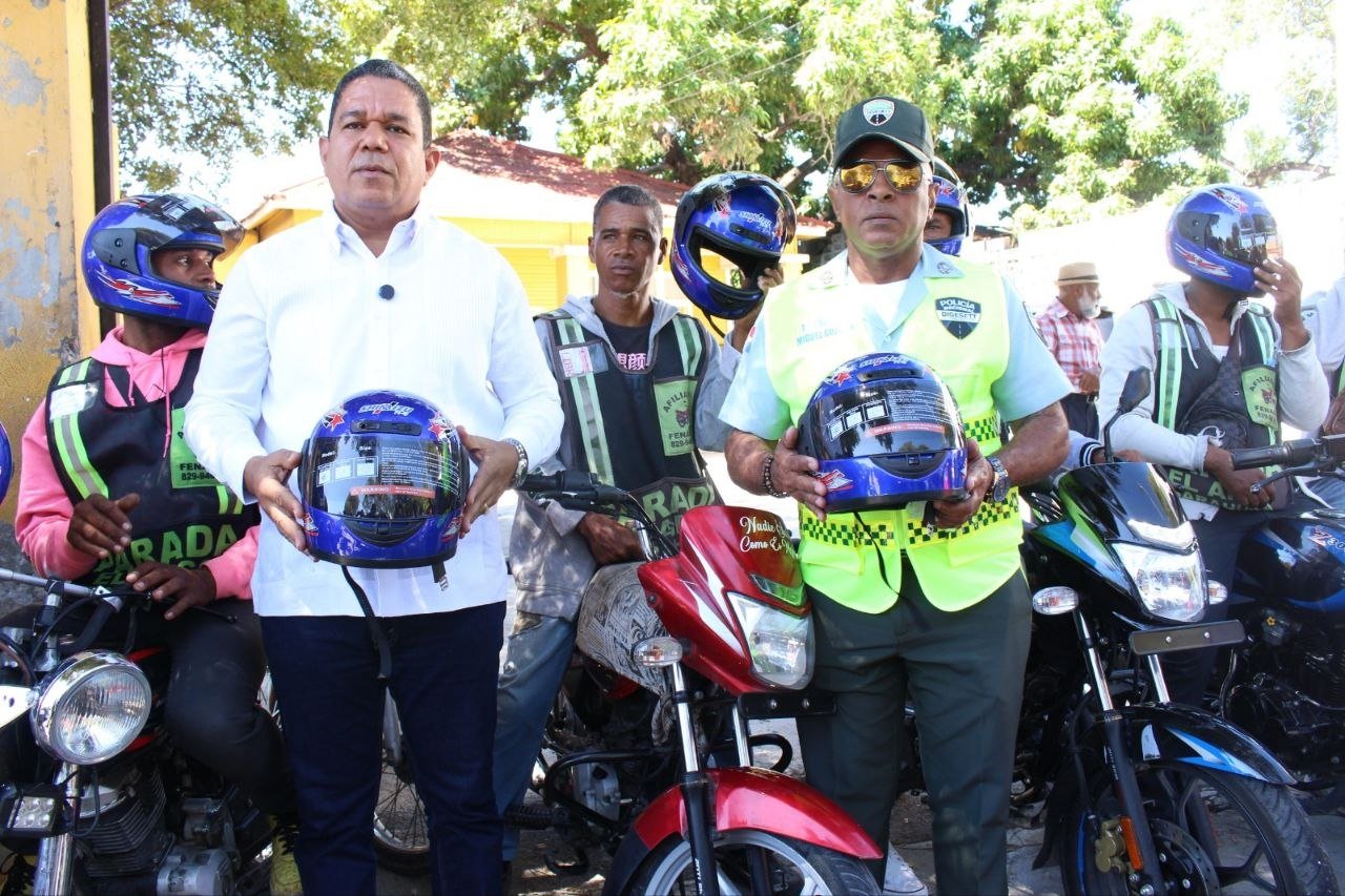 Senador Moisés Ayala entrega en compañia de la DIGESETT cascos protectores a motoconchistas en Barahona