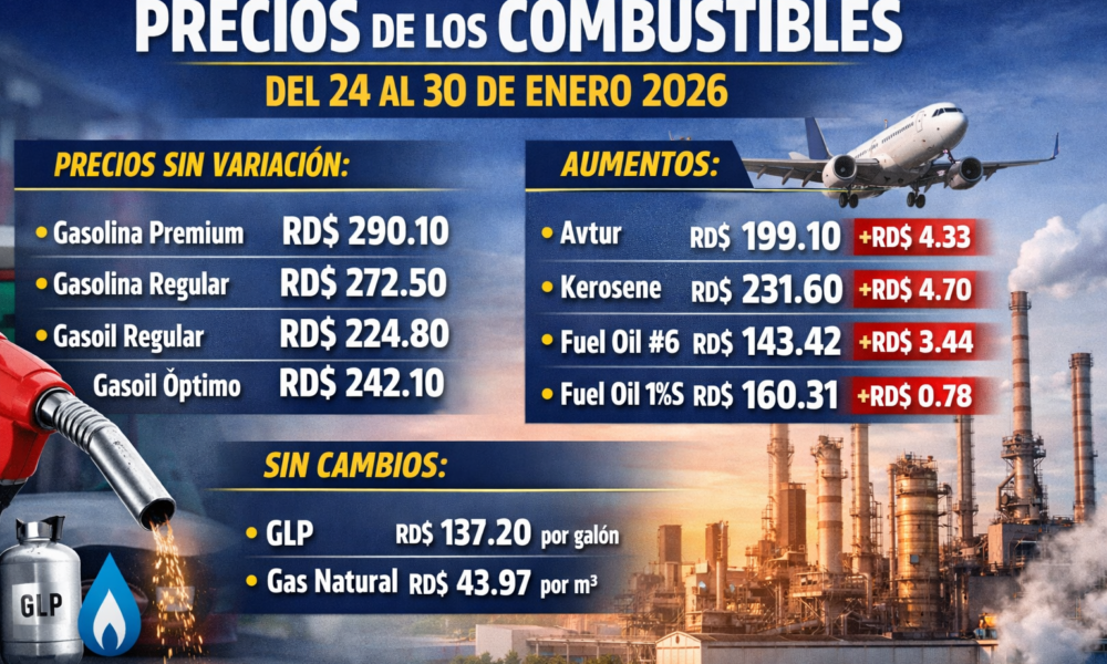Santo Domingo.– El Gobierno dominicano informó los precios de los combustibles que estarán vigentes durante la semana del 24 al 30 de enero de 2026, período...