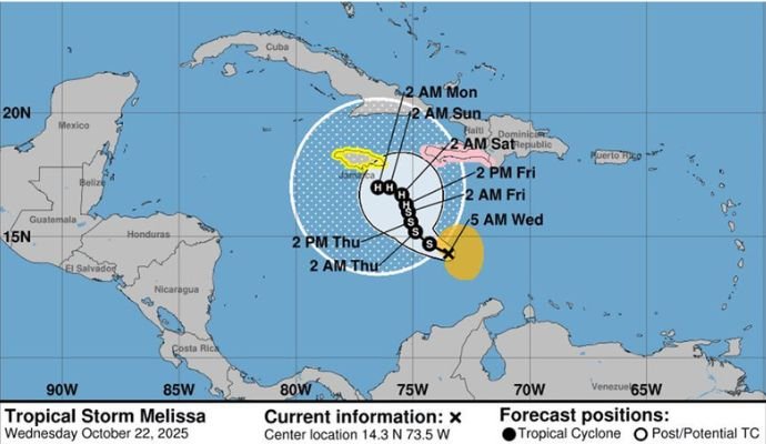 SANTO DOMINGO, R.D, 23 de octubre 2025– La tormenta tropical Melissa continúa desplazándose lentamente por el mar Caribe, generando fuertes aguaceros en distintas zonas del territorio...