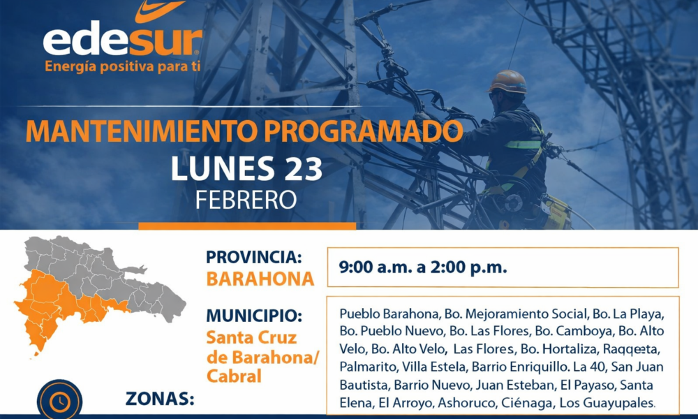 Barahona. La Empresa Distribuidora de Electricidad del Sur (EDESUR) informó que este lunes 23 de febrero ejecutará un mantenimiento programado en varios sectores de la provincia...