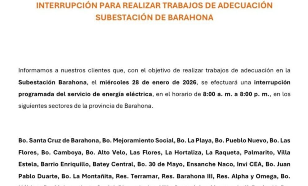 Por Ahora Noticias RD Barahona, R.D.– La Empresa Distribuidora de Electricidad del Sur (Edesur Dominicana) informó que este miércoles 28 de enero de 2026 realizará una...
